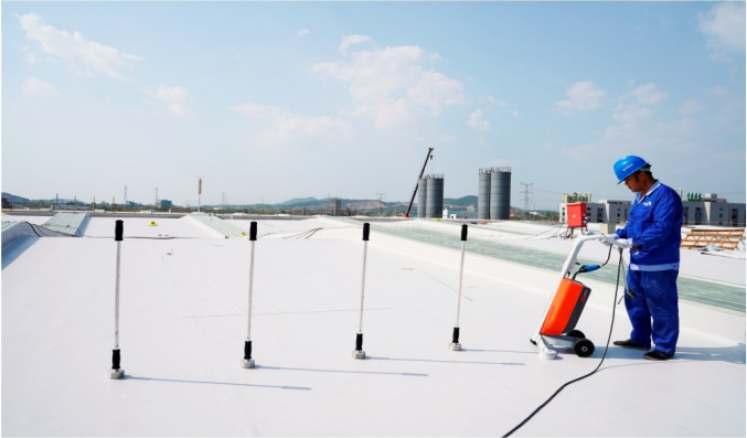 黃岡凱倫新材料科技有限公司是江蘇凱倫建材股份有限公司(以下簡稱凱倫股份)的全資子公司,成立于2015年8月,主要從事高聚物改性瀝青(有胎)防水卷材、自粘聚合物改性瀝青(無胎)防水卷材、防水涂料和聚氨酯地坪漆的研發、生產和銷售,是凱倫股份全國戰略布局中邁進中部市場的重要一步。此項目是凱倫股份黃岡廠房屋面,使用PVC單層屋面防水系統。 CL-PVC聚氯乙烯防水卷材